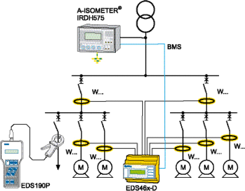Vigilantes de aislamiento en sistemas aislados IT, para circuitos de corriente principal en media tensión AC/DC, con componentes de corriente conectados directamente como rectificadores de corriente, convertidores, accionamientos de corriente continua regulados a tiristores, etc.