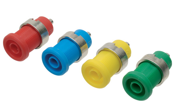 Tomas de corriente de baja tensión y protegidas contra contacto accidental con contactos de 2 mm y 4 mm de diámetro.
